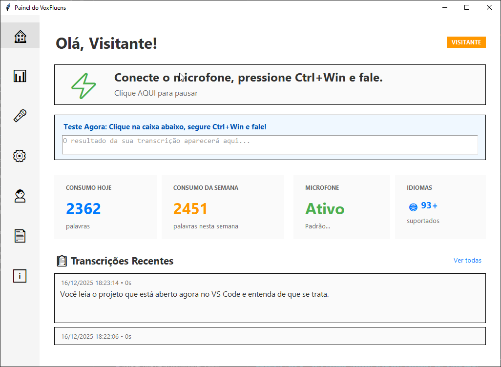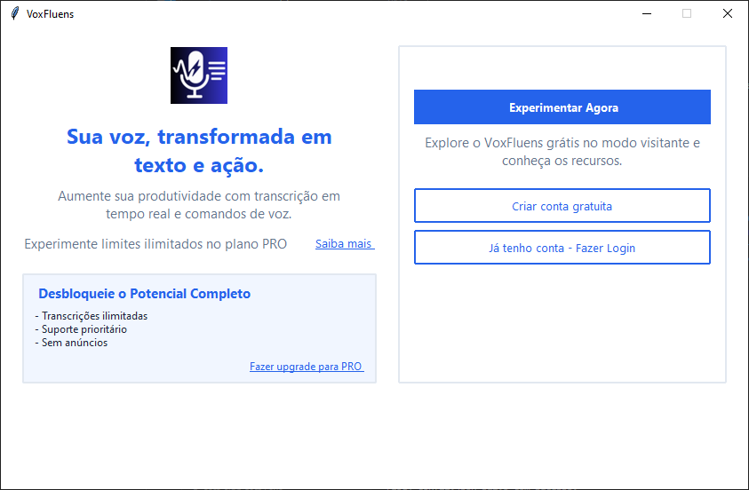 O VoxFluens funciona no Windows 10 ou 11 (64-bit). Recomendamos pelo menos 4GB de RAM e uma conexão estável com a internet para melhor desempenho.
