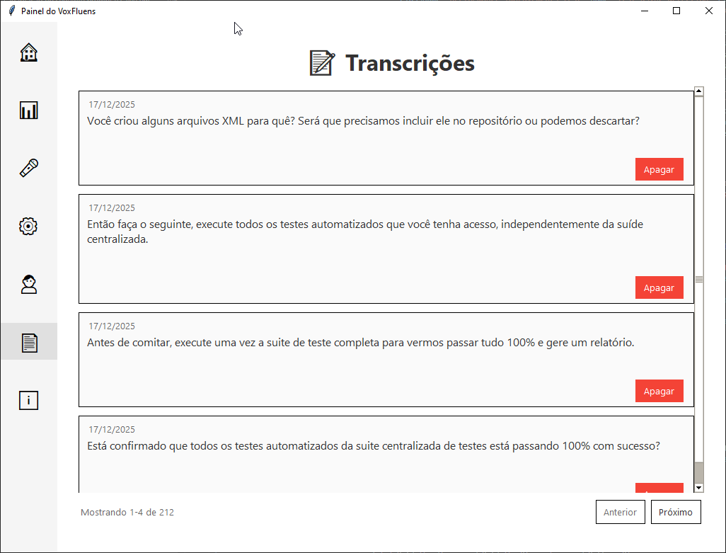 Pressione Alt+X em qualquer aplicativo e comece a falar. O VoxFluens usa IA avançada para transcrever sua voz em texto em tempo real, funcionando em qualquer programa onde você possa digitar.