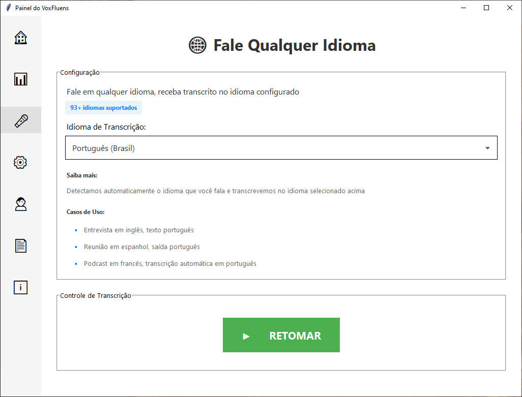 Precisa falar outro idioma? O VoxFluens também traduz sua fala em tempo real para inglês ou espanhol enquanto digita.